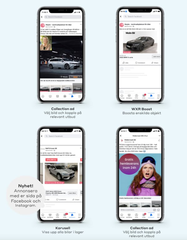 En spennende nyhet er at vi nå også kan tilby Branded WXR. Det innebærer at det er deres firmanavn som er avsender, men vi sørger for integrasjonen av bilene. Det eneste vi trenger er å få tilgang til deres konto på Facebook og Instagram.